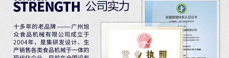 廣州旭眾食品機械有限公司是一家集科研開發(fā),生產(chǎn)設(shè)計,營銷服務(wù)為一體的現(xiàn)代化生產(chǎn)企業(yè)。現(xiàn)代化生產(chǎn)車間,精湛制造技術(shù),所產(chǎn)機械歷經(jīng)市場重重考驗,不斷贏得海內(nèi)外客戶的贊譽。