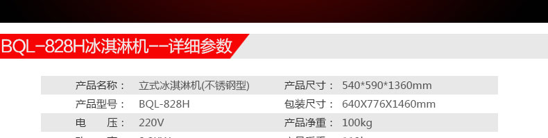 名稱BQL-828H立式冰淇淋機(jī) 電源220V 功率2.2kw 產(chǎn)量18-28L/h 尺寸540*590*1360mm 重量119kg 規(guī)格 其他