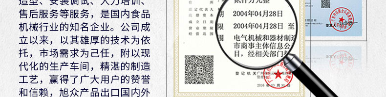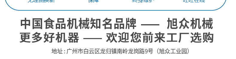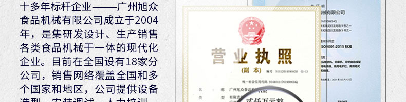 廣州旭眾食品機(jī)械有限公司是一家集科研開(kāi)發(fā),生產(chǎn)設(shè)計(jì),營(yíng)銷(xiāo)服務(wù)為一體的現(xiàn)代化生產(chǎn)企業(yè)?,F(xiàn)代化生產(chǎn)車(chē)間,精湛制造技術(shù),所產(chǎn)機(jī)械歷經(jīng)市場(chǎng)重重考驗(yàn),不斷贏得海內(nèi)外客戶的贊譽(yù)。