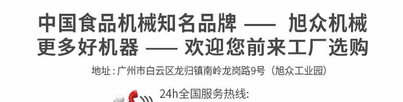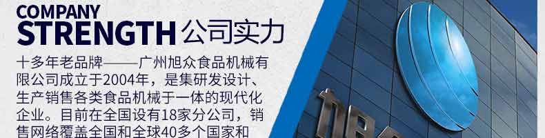 廣州旭眾食品機(jī)械有限公司是一家集科研開發(fā),生產(chǎn)設(shè)計,營銷服務(wù)為一體的現(xiàn)代化生產(chǎn)企業(yè)?,F(xiàn)代化生產(chǎn)車間,精湛制造技術(shù),所產(chǎn)機(jī)械歷經(jīng)市場重重考驗,不斷贏得海內(nèi)外客戶的贊譽(yù)。