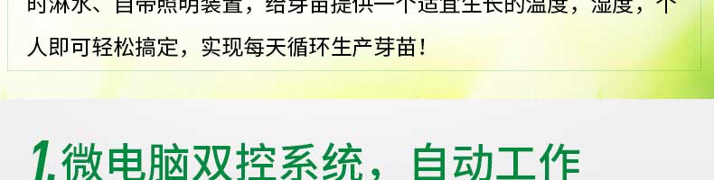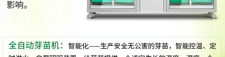 芽苗機(jī)系列,全自動(dòng)芽苗機(jī):智能化一生產(chǎn)安全無公害的芽苗,智能控溫、定時(shí)淋水、自帶照明裝置,給芽苗提供一個(gè)適宜生長的溫度,濕度,個(gè)人即可輕松搞定,實(shí)現(xiàn)每天循環(huán)生產(chǎn)芽苗!