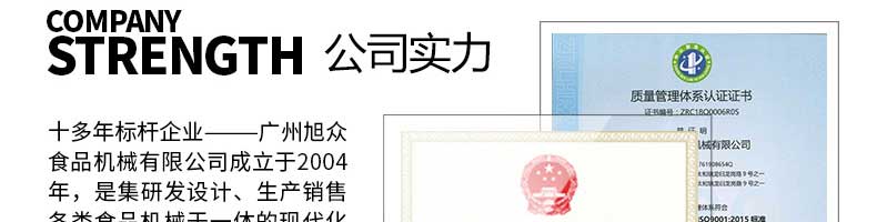 廣州旭眾食品機(jī)械有限公司是一家集科研開發(fā),生產(chǎn)設(shè)計(jì),營銷服務(wù)為一體的現(xiàn)代化生產(chǎn)企業(yè)?,F(xiàn)代化生產(chǎn)車間,精湛制造技術(shù),所產(chǎn)機(jī)械歷經(jīng)市場重重考驗(yàn),不斷贏得海內(nèi)外客戶的贊譽(yù)。