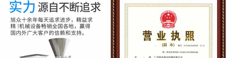 廣州旭眾食品機(jī)械有限公司是一家集科研開發(fā),生產(chǎn)設(shè)計(jì),營銷服務(wù)為一體的現(xiàn)代化生產(chǎn)企業(yè)。現(xiàn)代化生產(chǎn)車間,精湛制造技術(shù),所產(chǎn)機(jī)械歷經(jīng)市場重重考驗(yàn),不斷贏得海內(nèi)外客戶的贊譽(yù)。